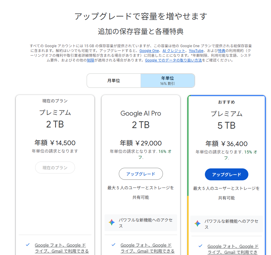 ・旧プレミアム(AIなしの2TB)でも使えるようだが、毎月払いに変更必須っぽい