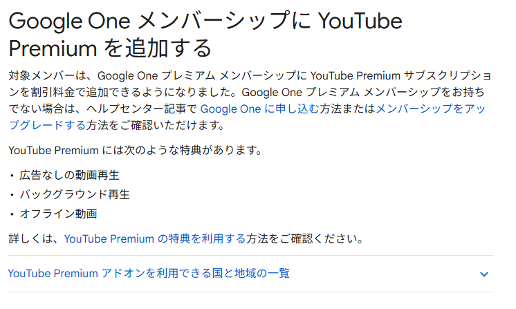 まず、出典はGoogle Oneヘルプの「Google One メンバーシップに YouTube Premium を追加する」