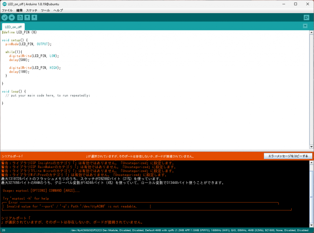 」が選択されていますが、そのポートは存在しないか、ボードが接続されていません。