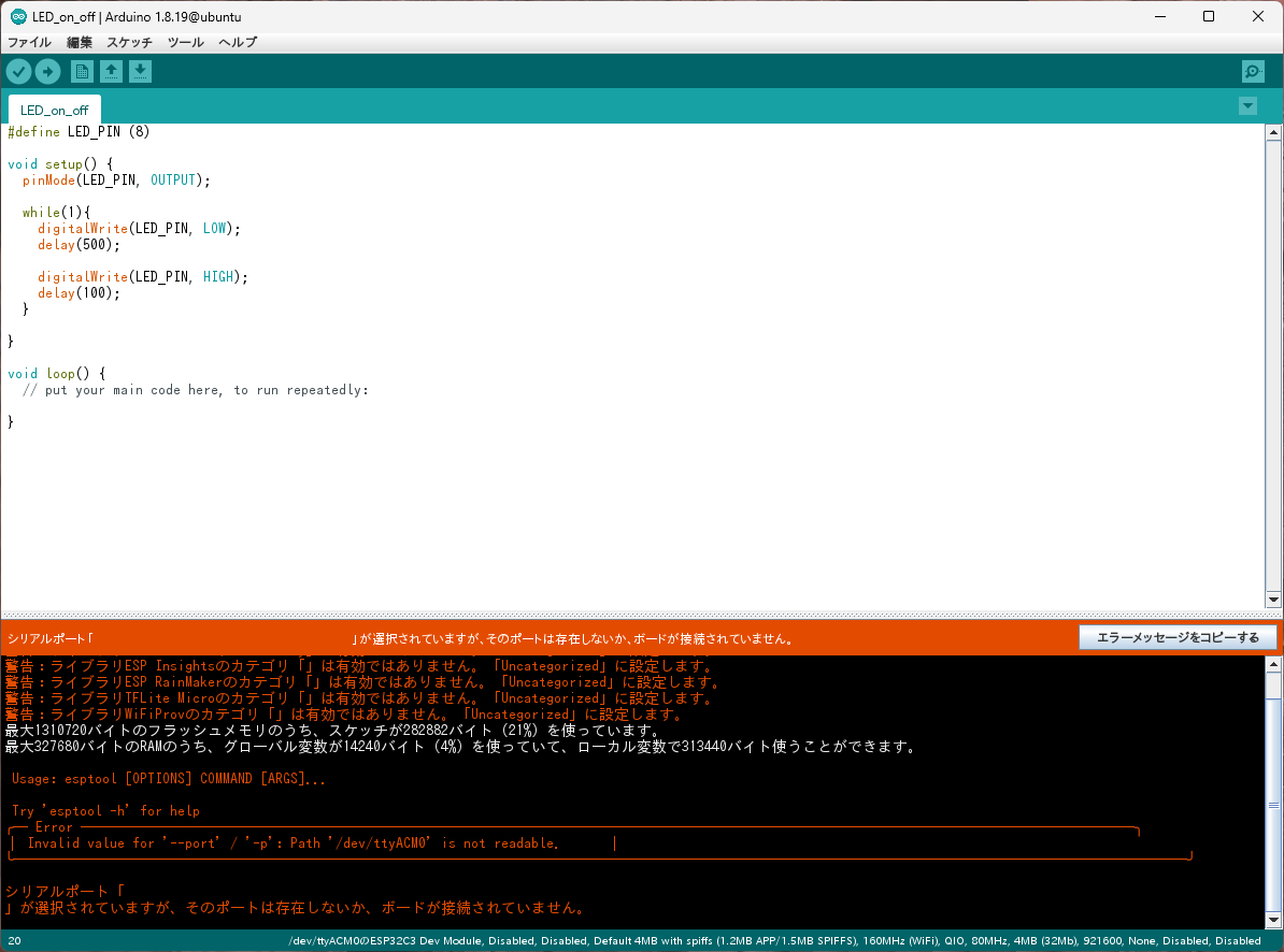 Arduino:1.8.19 (Linux), ボード:"ESP32C3 Dev Module, Disabled, Disabled, Default 4MB with spiffs (1.2MB APP/1.5MB SPIFFS), 160MHz (WiFi), QIO, 80MHz, 4MB (32Mb), 921600, None, Disabled, Disabled"